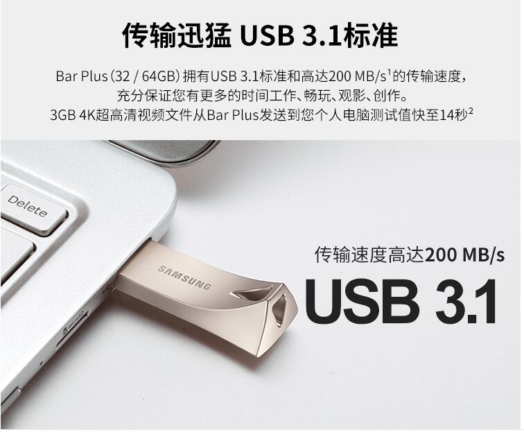 三星優(yōu)盤64GB USB3.1 U盤 BAR升級(jí)版+高速汽車載歌曲金屬外殼精致